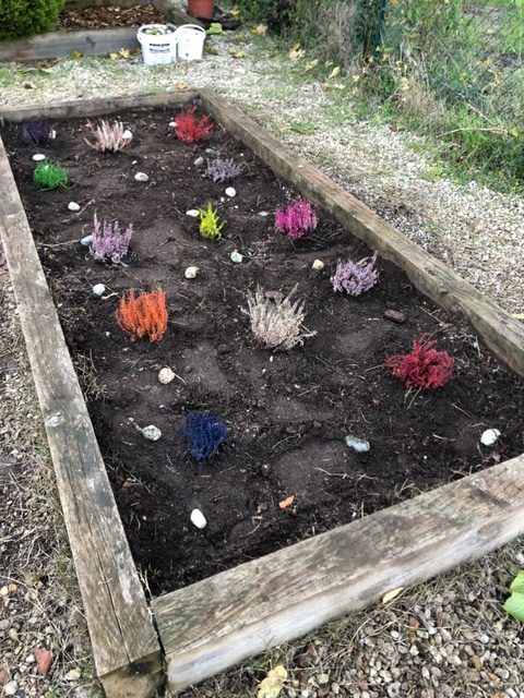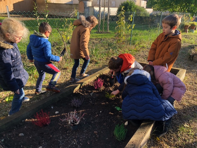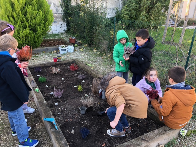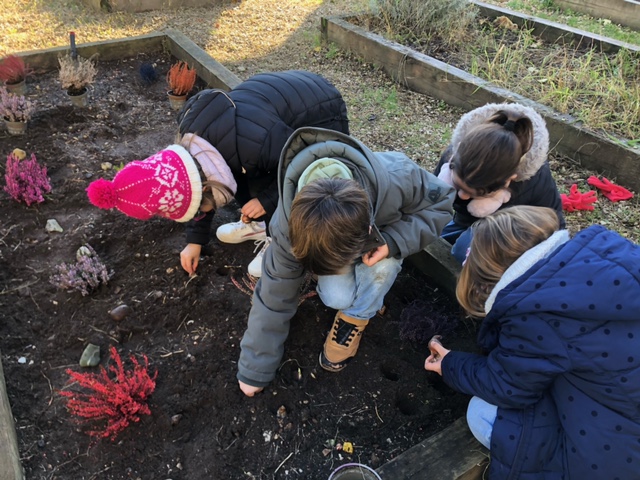 Ensuite, les CP ont planté des bruyères de couleurs d’Halloween et des bulbes de printemps.