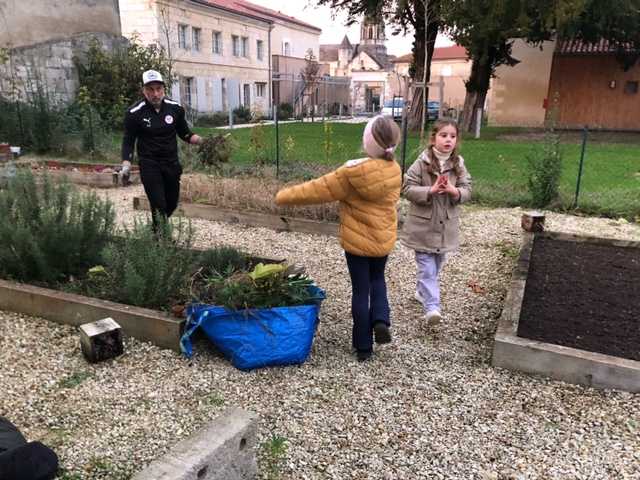 Les élèves de la classe de CP ont tout d’abord entamé le désherbage avec leurs petites mains, mais l’aide de deux papas a été indispensable pour faire « peau neuve » dans les différents bacs. Merci encore à eux !