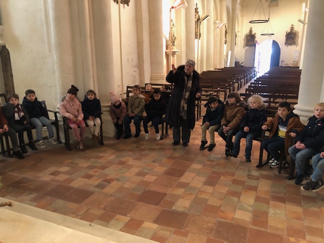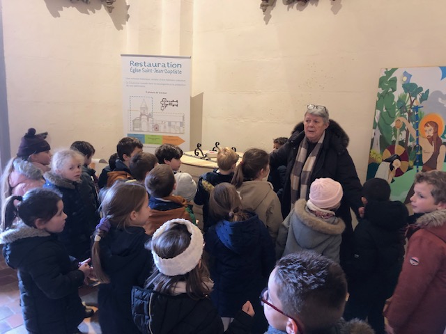 Les CP ont pu ainsi observer la belle façade de l’église Saint Jean-Baptiste et sa grande porte d’entrée ; ils ont découvert les différents lieux et objets sacrés comme le baptistère, le pupitre de lecture, le Tabernacle, les vitraux, les statues.