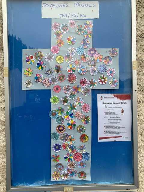 De la petite section au CM2, les élèves se sont préparés à vivre un moment important : la Semaine Sainte, en réalisant de jolies cartes, en confectionnant collectivement une belle croix fleurie et en célébrant, avec l’ensemble de la communauté éducative, le dernier repas de Jésus avec ses apôtres.
