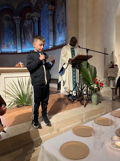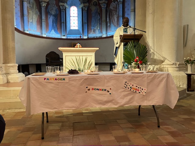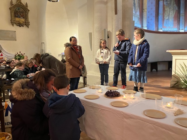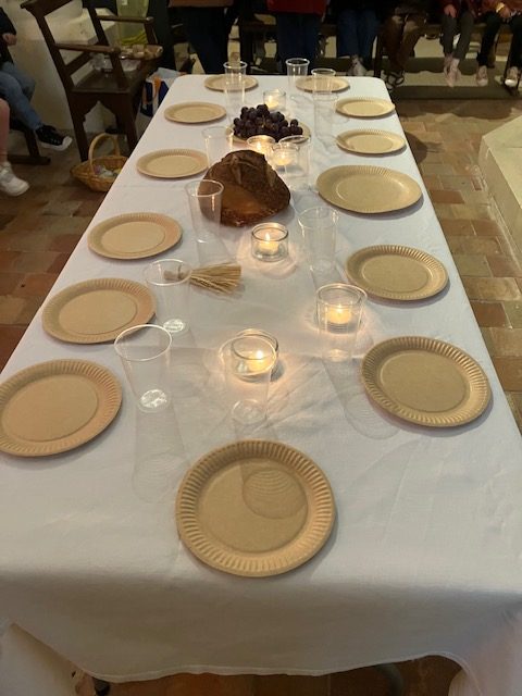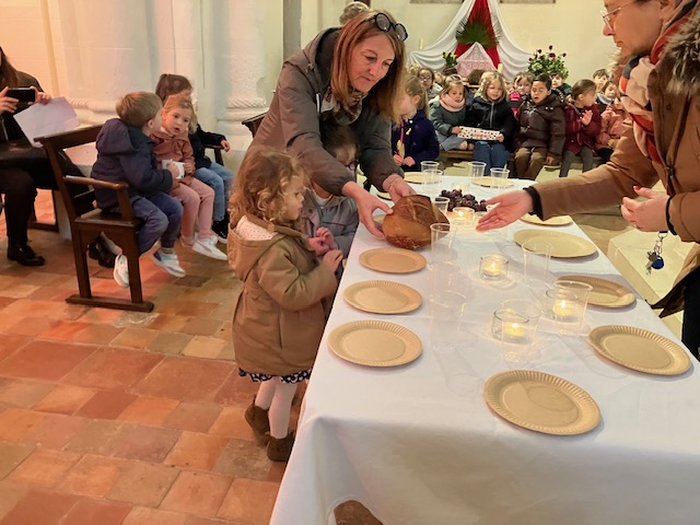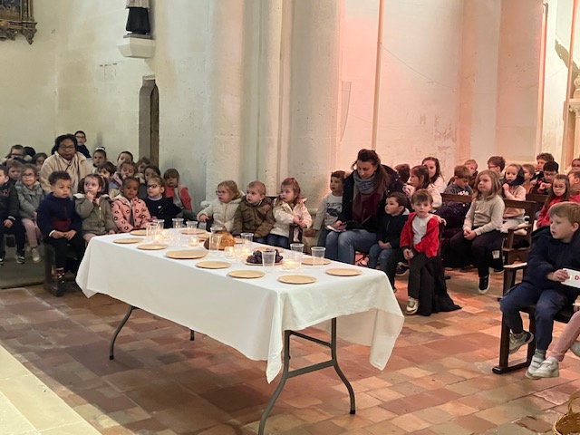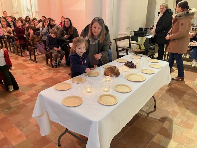 Seigneur, comme les amis de Jésus, nous sommes rassemblés autour de toi… Merci Jésus, pour le partage de ce pain et de ce vin, pour ton amour envers les hommes, pour donner ta vie… partageons le pain, partageons notre amour à tous nos frères avec nos petits pains décorés en classe….